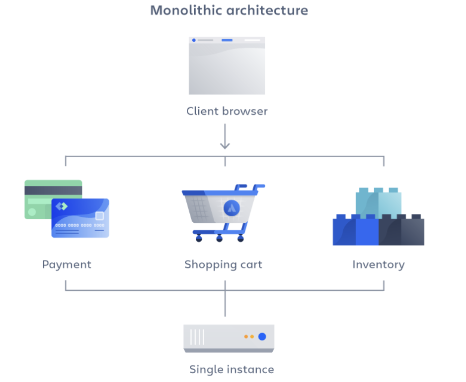 마이크로서비스처럼 모듈 단위로 쪼개는 것이 아닌 하나의 프로젝트로 전체 애플리케이션을 묶어서 개발하기 때문에 점점 데이터베이스가 커지는 구조이다.